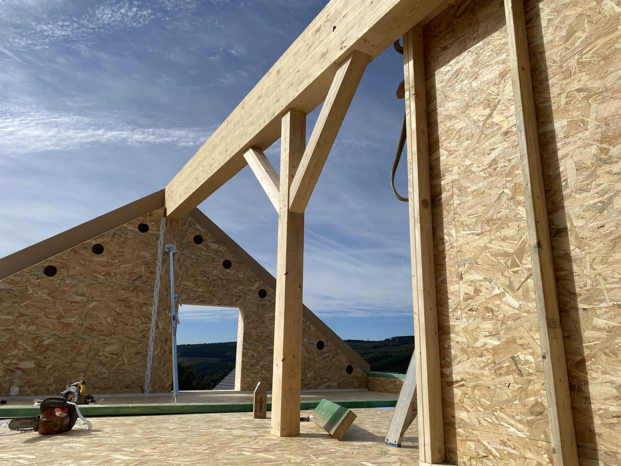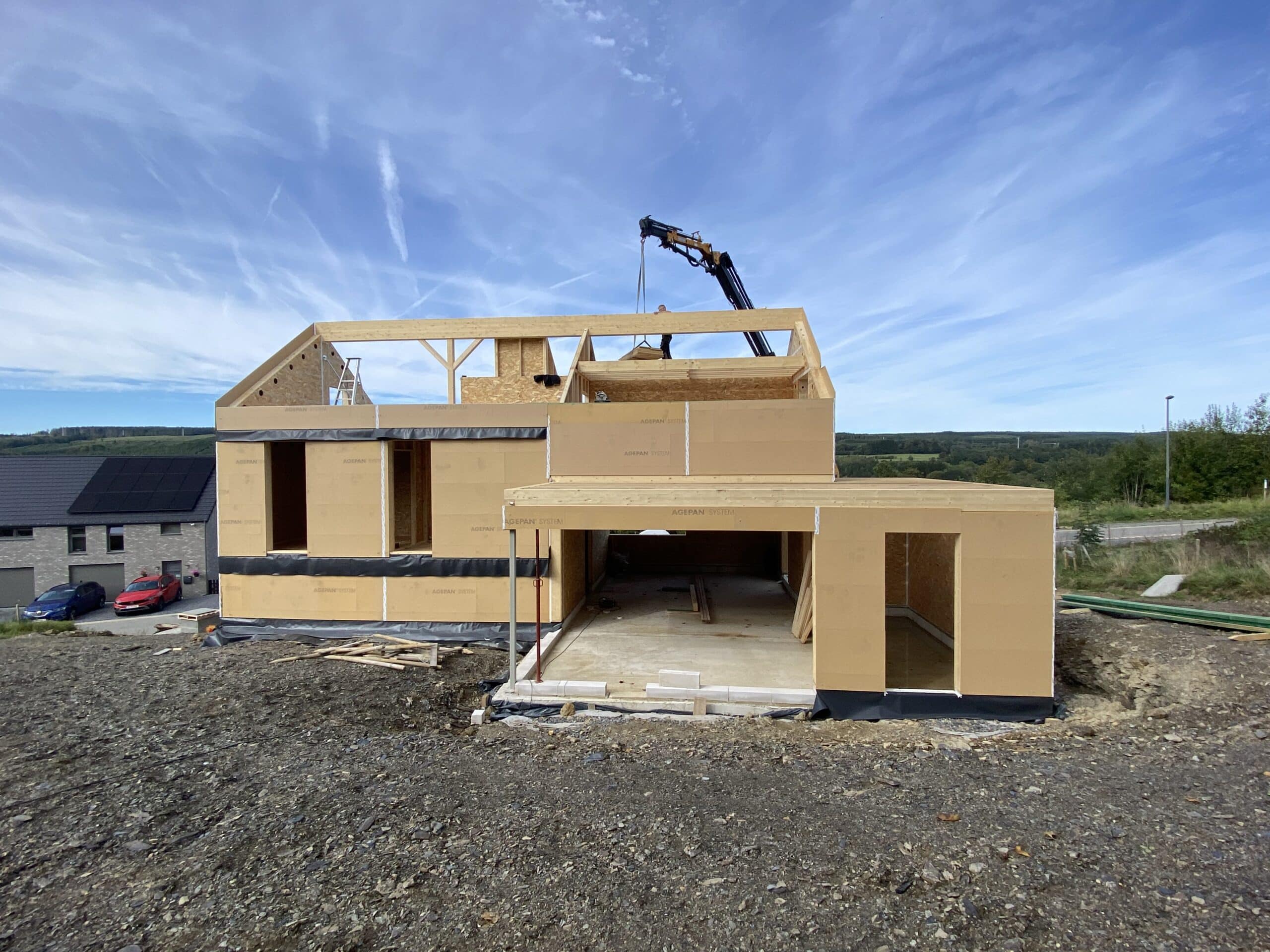 Le montage de cette maison prêt du circuit de Spa-Francorchamps n’a duré que 10 jours ouvrables pour l’ossature, la charpente, la couverture en tuile terre cuite et la pose des châssis aluminium.